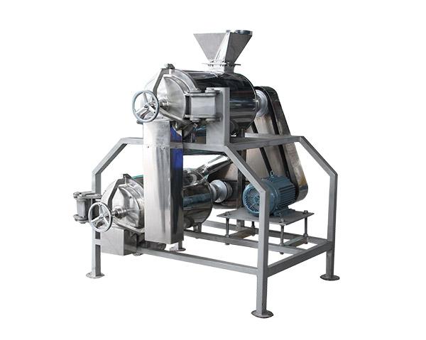 1、DJ型打漿機:電動機經過皮帶傳動,使安裝在花鍵上的刮板高速旋轉,當經過破碎的生果經過進料口進入機內時,接漿盤就把物料均勻排發到刮板和篩網處。因為刮板的反轉效果和導程角的存在,使物料沿著圓筒向出口端移動,移動的軌道呈螺旋狀,物料就在刮板和篩筒之間移動進程中受離心力的效果而被擦碎,汁液和肉質(已成漿狀)從篩孔中經過送入下道工序,(雙道、三道打漿機為聯動重復上列進程)皮和籽等則從出渣斗排出,以到達主動別離的意圖。只需改換不同標準的篩網以及調整刮板導程角的巨細,可改動不同的打漿速度,取得滿足的效果。