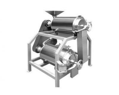 電動機通過皮帶傳動,使安裝在花鍵上的刮板高速旋轉,當經過破碎的水果通過進料口進入機內時,接漿盤就把物料均勻排發到刮板和篩網處。由于刮板的回轉作用和導程角的存在,使物料沿著圓筒向出口端移動,移動的軌跡呈螺旋狀,物料就在刮板和篩筒之間移動過程中受離心力的作用而被擦碎,汁液和肉質(已成漿狀)從篩孔中通過送入下道工序,皮和籽等則從出渣斗排出,以達到自動分離的目的。只要變換不同規格的篩網以及調整刮板導程角的大小, 可改變不同的打漿速度,獲得滿意的效果;