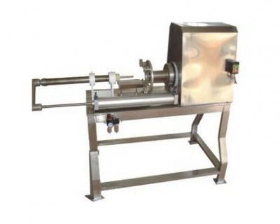 該設備適用于菠蘿的去皮,通過本機可以完成去皮,捅心兩道工序,以得到圓柱形菠蘿果筒。菠蘿用人工切去頭尾兩端后,由人工擺放在放料架上,放料架可調節(jié)中心高度;由氣缸將菠蘿向前推送,經過特制劃皮刀將菠蘿外皮劃破,推入高速旋轉著的去皮刀筒,將菠